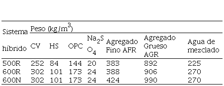 A partir de la optimización del cementante (HCV) se produjeron concretos utilizando 100 % agregados reciclados (CHCV-AR), con una cantidad de cementante de 500 y 600 kg/m3. (500 R y 600 R respectivamente) y un concreto referencia utilizando 600 kg/m. de HCV y agregados naturales (CHCV-AN) (600 N). La combinación granulométrica de agregado fino y agregado grueso en % en peso, ya sea reciclado o natural, se estableció en 30 % y 70 % respectivamente. La dosificación de la mezcla se realizó adaptando el “método del volumen absoluto” propuesto en la ACI 211.1 (Tabla 4).