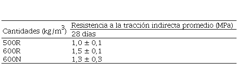 Los resultados obtenidos en los ensayos de tracción indirecta (RTI) de las mezclas de concreto a los 28 días de curado se muestran en la Tabla 6. Se evidencia que la RTI de la mezcla 600 R, en comparación con las mezclas 500 R y 600 N, tiene un valor promedio de 1,5 MPa, probablemente esto pueda atribuirse a una mayor adhesión a la matriz por parte de los agregados reciclados. Estos resultados de RTI corroboran los obtenidos en RC en donde se presentó la misma tendencia.