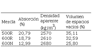 En la Tabla 8 se muestran los resultados de las propiedades físicas evaluadas en las mezclas de concreto a los 28 días de curado como lo son densidad aparente, porcentaje de absorción y porosidad determinados mediante la norma NTC 5653 [29]. Los valores de densidad aparente de las mezclas evaluadas se encuentran en el rango de los reportados para concretos convencionales basados en OPC. La mezcla 600 N tiene la mayor densidad entre las tres mezclas de concreto, con un valor de 2680 kg/m3, esto se debe a que la densidad de los agregados naturales es mayor comparada a la de los agregados reciclados.