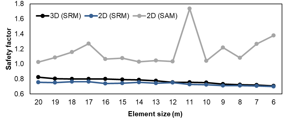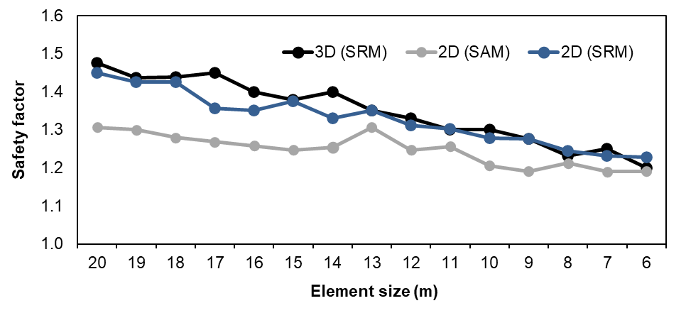 Observations from Figure 9 indicate a close resemblance between the 3D and 2D models employing the SRM method, with minor discrepancies in element sizes 17 and 14 meters, exhibiting differences of 6.9 % and 4.9 %, respectively. In contrast, the SAM model initially presents variations exceeding 10 %. However, from element size 13 onwards, the outcomes stabilize, and starting with mesh 8, the safety factors generated by both models converge, achieving a mere 3 % difference in meshes 8 and 6. Additionally the simple ANOVA indicated a difference of -0.019 within the SRM method, suggesting that the means are very similar. However, between SAM and SRM, there is a difference of -0.08, this indicates that the differences are statistically significant at the 95 % confidence level. Regardless of this ANOVA result, it is evident that as the element size grows, both models converge towards the same value. However, when those results are compared to studies by [23] and [4], it is found that these values do not coincide with the results obtained in the gentle slope.