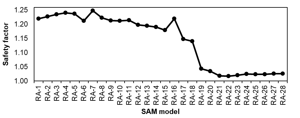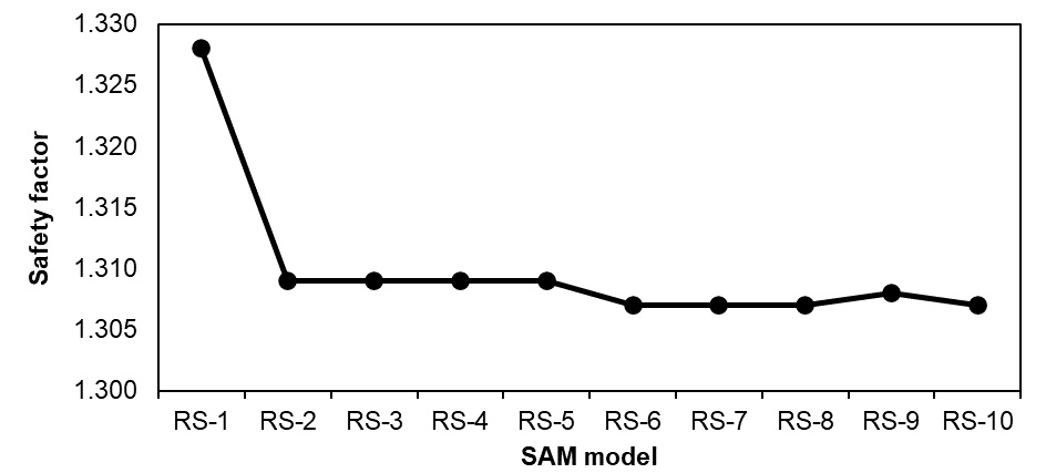 As can be observed in Figure 7, starting with the RA-19 model, the safety factors show a decreasing trend due to the change in slope of the line grid, reaching stability in the results with maximum variations of 2.48 % between the R-19 and R-22 models. The calibration was carried out with the RA-22 model, as it was with this model that the most critical safety factor was obtained. This model (RA-22) has 100 centers in the Center Grid and 20 lines in the Line Grid, with a slope of -1.21 %. Figure 8 shows the results for the gentle slope model.
