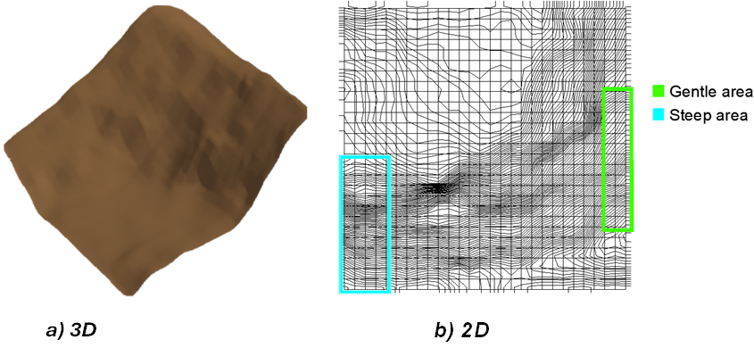 To evaluate two slope conditions, a topographic relief in the Tibetan region was selected. A real mountainous terrain occupying an area of 800 m2 was selected and after obtaining the contour lines through the CADMAPPER website [24]-[27], the topography of the site was reproduced using the Autodesk Revit drawing tool, as shown in Figure 1.