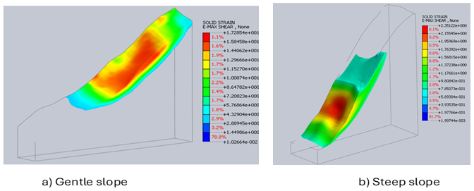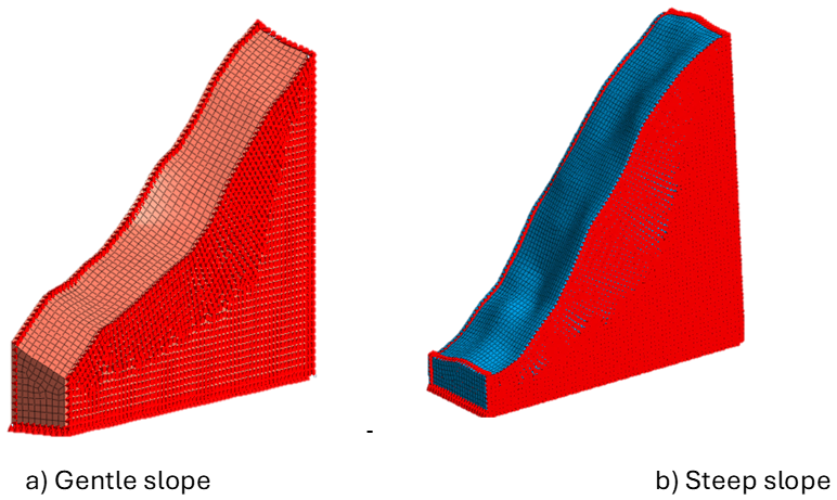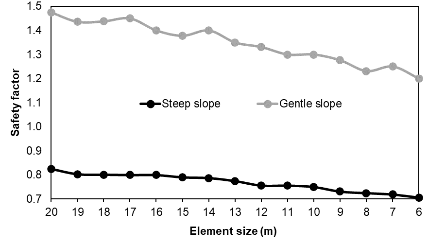 For the gentle slope, the model corresponding to the element size of 9 m is adopted as the optimal one, since the safety factor error is less than 5 % and it has a computation time of 9 minutes. In the case of the steep slope, the 9 m model represents an increase in computation time of 25 % compared to the 10 m model; however, the error in the safety factor value of the 10 m model is 6.6 % compared to the 6 m model. Although the run time is longer, the 9 m model is selected in order to increase the accuracy of the results.