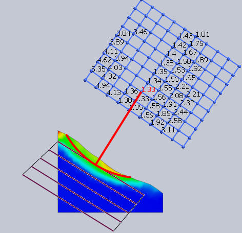 As can be observed, the Center Grid (blue) represents the center of the soil failure curve, while the Line Grid (red) represents the tangent lines to this curve.