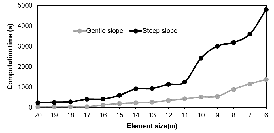 As can be observed in Figure 5, starting from a mesh density of 9 m, the computation time for the gentle slope model begins to increase compared to the other models, with a difference of almost 60 % compared to the run with an element size of 6 m. On the other hand, for the steep slope model, the computation time increases rapidly starting from 11 m, with a difference of 80 % compared to the 6 m model.