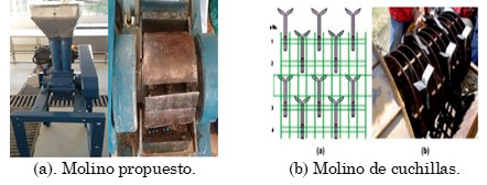 El molino rotatorio fue diseñado y construido completamente con todos sus partes para que funcione correctamente, el cual consta de matrimonio conector, motor con una potencia de 2 HP, una base de molino construido en hierro con doble capa de pintura, botonera on/off, el cuerpo del molino en acero con una polea, tres o más cuchillas horizontales montadas sobre el rotor, una caja cilíndrica que internamente cuenta con tres barras tipo martillo y su separación es de 3 mm entre las cuchillas. Esto facilitó la molienda de la biomasa, generando un impacto entre las cuchillas por acción de la gravedad y su alimentación al ciclo rotativo para la obtención de la molienda de la biomasa en el equipo que fue construido, logrando el tamaño de granulometría deseado para los análisis físicos, químicos y térmicos de las biomasas, al igual que otros equipos de laboratorio mencionados por [18]