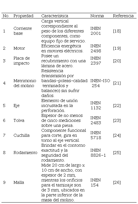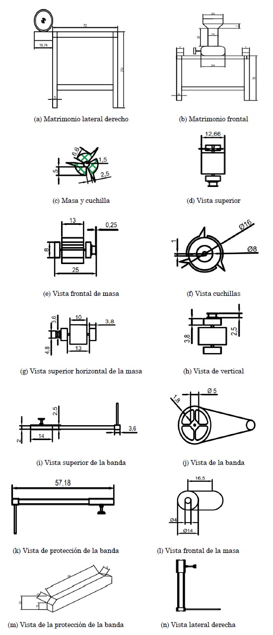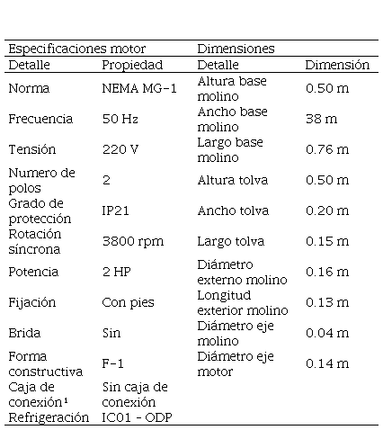 En la Tabla 2 y la Tabla 3 se describen las características, dimensiones, especificaciones del equipo y funcionamiento del triturador con su respectivo motor, con base en las normas nacionales e internacionales. El equipo produciría 240 gramos de serrín por minuto. Sin embargo, la capacidad de producción del molino puede variar de acuerdo con el grado de humedad, peso específico, densidad y condiciones de trabajo.
