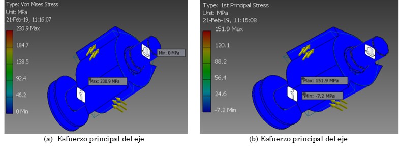 Los resultados del análisis de tensión de las magnitudes físicas sobre el eje principal, realizado por el software Autodesk Inventor, muestra que el diseño plástico del equipo para la molienda de la biomasa forestal es semejante al diseño del material flexible de la misma biomasa forestal [47]. Uno de los valores que se tiene en cuenta es la fuerza principal del eje 1, donde el plano normal muestra la traza cortante en 0 y el máximo de la elasticidad inducida en la pieza para las condiciones de carga es de 230.9 MPa, tal como se muestra en la Figura 3 (a). De acuerdo con lo anterior, el esfuerzo principal del eje o husillo muestra que la resistencia está entre -7.2-151.90 MPa, como se observa en la Figura 3 (b).
