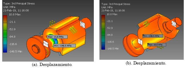 La principal restricción de las cantidades físicas del desplazamiento, realizado mediante el software Autodesk Inventor, indica que su desplazamiento y la resistencia del material plástico de la trituradora de la biomasa cuenta con un valor de carga máxima de 10.80 MPa, y un mínimo -148.50 MPa, según el diagrama ilustrado en la Figura 4 (a y b).