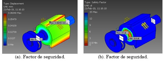 El factor de seguridad del rodamiento, realizado con Autodesk Inventor, mostró que las medidas de las cuchillas cortantes del triturador de biomasa arrojaron un valor de 0.07 mm máximo, un mínimo de 0.90 μL, y de máximo 15 μL requeridos para la grasa, con el fin de evitar el endurecimiento de la masa del eje, según su trabajo de movimiento, lo cual se detalla en las Figura 5 (a y b).