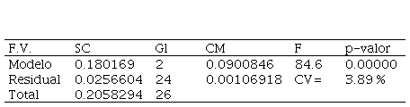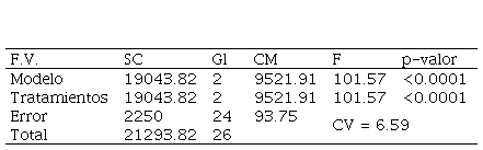 Se realizó un análisis estadístico del diseño experimental utilizando parcelas divididas y bloques al azar, contando con veintisiete unidades experimentales, como se detalla en el análisis de varianza que se muestra la Tabla 7.