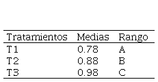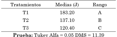 Los análisis de la varianza se realizaron con el fin de conocer la relación de la eficiencia del molino entre la biomasa, tomando en cuenta las diferencias y las pérdidas por flujo de biomasa y por los cambios de humedad, las cuales se hicieron de forma manual; sin embargo, fueron significativas entre estos tres tratamientos (T1-T3) en la experimentación con astillas, con una eficiencia del proceso de molienda, arrojando un coeficiente de Fisher del 84.6 %, con una probabilidad de ocurrencia menor al 0.01 % y con un coeficiente de variación de 3.89 %, permitiendo obtener una alta confiabilidad, con prueba de Tukey al 5 % (ver Tabla 9). El valor total de las medias de tratamientos T1-T3 van de 0.78 % a 0.98 %, y las diferencias se deben a que el flujo de biomasa no es constante, esto en el mismo orden del análisis de Tukey en relación con el tiempo de 122.13-80.27 segundos. Lo anterior implica establecer parámetros que cumplan con las necesidades del prototipo y brindar esta alternativa de solución relacionada con el campo mecánico e industrial, basada en el modelo matemático obtenido [51].
