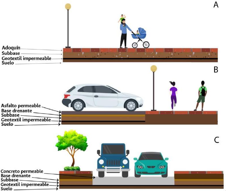Se seleccionaron PP sin infiltración directa al suelo (es decir con conducción de sus aguas) ya que la cuenca presenta altas pendientes y se pueden presentar deslizamientos debido al agua infiltrada. De manera que, los PP propuestos se diseñan sin infiltración a la subrasante, es decir como estructuras de almacenamiento, los cuales tendrán como objetivo atenuar la escorrentía superficial en la zona de estudio. Se seleccionaron PP para vías vehiculares de tráfico liviano en asfalto permeable, parqueaderos en concreto permeable y áreas comunes en adoquines de concreto permeables (Figura 2).
