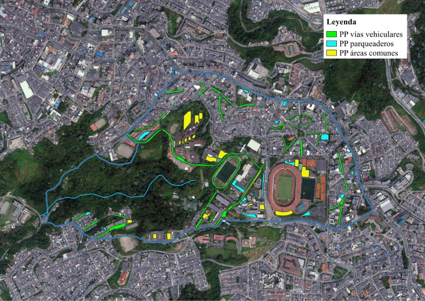 La selección de los espacios se realizó utilizando Google Maps y la cartografía base de la Alcaldía de Manizales. Los PP en parqueaderos se propusieron teniendo en cuenta aquellos con áreas superiores a 100 m2 debido a la relación directamente proporcional del área permeable del pavimento con la capacidad de atenuación de escorrentía superficial. Los PP de áreas comunes se propusieron en canchas de microfútbol o baloncesto, parques deportivos, bulevares, plazas universitarias, entre otros. Se consideraron zonas comunes con áreas superiores a 100 m2. De manera que, teniendo en cuenta lo anterior se obtuvieron 50 PP en vías vehiculares (V), 20 PP en parqueaderos (P) y 20 PP en áreas comunes (C) como se indica en la Figura 3. En total los 90 PP cubren 328321.84 m2 (0.032 km2) es decir el 2.25 % del área impermeable de la cuenca (1.42 km2), los PP en vías vehiculares representan el 70.50 % del área total de los PP propuestos, en parqueaderos el 11.50 % y en áreas comunes el 18.00 %.