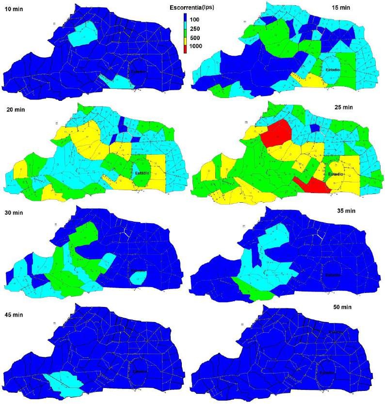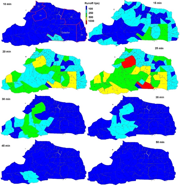 En la Figura 4 se observa que, a los 10 minutos de iniciada la lluvia comienza la respuesta de la cuenca (es decir, muy rápidamente) en las subcuencas 19 y 22, a los 15 minutos la escorrentía superficial se ha incrementado en todas las subcuencas especialmente en la zona urbanizada en la parte alta de la misma, donde se presentan valores entre 100-500 l/s de escorrentía, incluso la subcuenca 22 presenta valores entre 500-100 l/s (subcuenca en amarillo en la Figura 4 para el minuto 15). Para ese minuto, las Subcuencas 19 y 22 presentan los valores pico más altos (> 1000 l/s), seguidas muy de cerca por subcuencas cercanas (observar en verde varias subcuencas en la Figura 4). Para el minuto 25, las subcuencas 19 y 22 (subcuencas en rojo) presentan valores máximos; aquí es importante mencionar que en la parte baja varias subcuencas presentan valores altos de escorrentía desde el minuto 20. El anterior comportamiento se presenta debido a las altas pendientes de dichas subcuencas (> 48 %) y de los conductos, lo que genera altas velocidades. De manera que el minuto 25, la mayor parte de la cuenca está con valores de escorrentía superiores a los 250 l/s. En el minuto 30, gran parte de la escorrentía es evacuada, ya que se presenta una disminución considerablemente de estos flujos y a partir de allí en 15 minutos más se evacúan totalmente estos. De manera que, los volúmenes más altos de escorrentía se presentan muy rápidamente, entre los 15-25 minutos de iniciada la lluvia, siendo el minuto 25 el más crítico si se tiene en cuenta la cantidad de subcuencas con altos volúmenes de escorrentía superficial.
