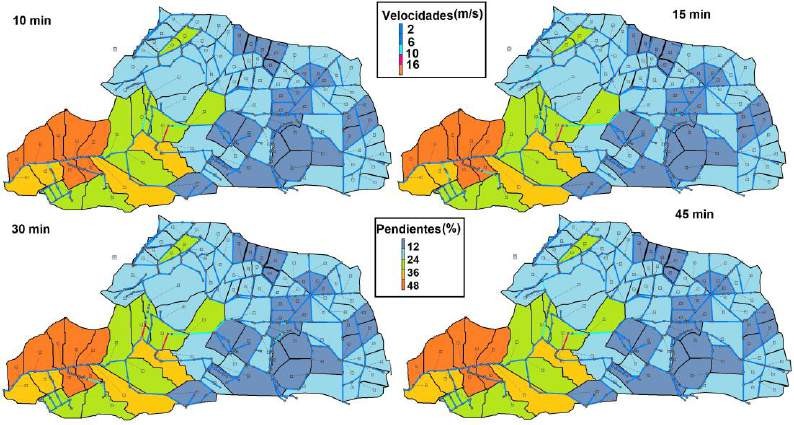 A diferencia de lo que sucede con la escorrentía, las velocidades son especialmente altas (superiores a 6 m/s) solo en unos pocos conductos (Figura 5). Dichas velocidades se comienzan a visualizar desde el minuto 10, siendo persistente la situación hasta casi una hora después de iniciada la lluvia. Al comparar con las pendientes de las subcuencas se observa (Figura 5) que las mayores pendientes se encuentran en la zona baja de la cuenca, donde las velocidades no son especialmente altas, excepto por un par de conductos al sur. Sin embargo, en la parte media las pendientes, aunque no son las más altas, siguen siendo considerables (superiores al 36 %), lo que aunado a las altas pendientes de los conductos que entregan al río, hacen que en esta zona se presenten las mayores velocidades en los conductos (superiores a la 10 m/s).