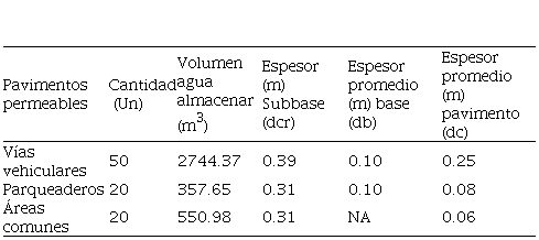 A partir de esta se obtuvo una precipitación de intensidad media 90.9 mm/h y lámina de agua de 33.33 m. El volumen de agua a almacenar se puede obtener bien sea mediante el método racional o el Número de Curva, siendo el primero el más utilizado. En este caso se utilizó el Método Racional utilizando la tabla de coeficientes de escorrentía C del Ministerio de Vivienda. Luego se obtiene la relación de impermeabilidad total como una proporción entre el área de PP considerada y el área tributaria total. Posteriormente, se obtiene la profundidad requerida para almacenar el agua dividiendo el volumen a almacenar entre el área multiplicada por una relación de vacíos considerada para dicha capa, la que se suele considerar superior al 30 % [46]. En terrenos inclinados se debe definir si se requieren barreras transversales para evitar el desbordamiento [42].