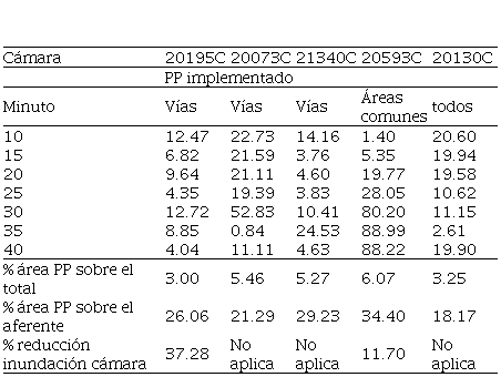 Los resultados son consistentes con otros reportados en la literatura, ya que reducciones en los volúmenes de escorrentía superiores al 30 % han sido reportadas solamente en PP que drenan a suelos arenosos [33], [52]-[55], sin embargo, los suelos de esta cuenca son suelos arcillosos por tanto las permeabilidades naturales son bajas. Por otro lado, las reducciones en el caudal punta también han sido reportadas, pero de manera menos frecuente, y en lo que menos impactan los PP en generar retrasos en alcanzar los caudales punta. En este caso, los PP reducen el volumen de agua en buen número (32 de 36) de cámaras de la red de drenaje en los momentos críticos, 17 de las cuales mayores al 25 % y las 15 restantes entre el 0 y el 25 %, lo que implica que las primeras 17 cumplirían con la reducción del 25 % del volumen de acuerdo la normativa colombiana. Mientras que para la duración total sólo se incrementan 3 cámaras adicionales, lo que quiere decir que los PP en los primeros minutos de un evento son determinantes para amortiguar los caudales punta. Sin embargo, en algunas cámaras se incrementa el caudal, lo que se atribuye a que en el minuto 20 se presentan tiempos de retardo debido al almacenamiento del agua en los PP, lo que eleva los caudales en el minuto 25 y por esto se da el incremento de caudal.