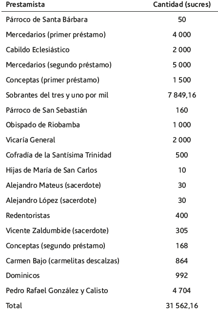 Los documentos de la temporalidad que se aborda no ofrecen todos los datos sobre los miembros del clero que prestaron auxilios monetarios al gobierno. Sin embargo, se sabe que los mercedarios, dominicos, conceptos, carmelitas descalzas, catalinas, hijas de María de San Carlos y redentoristas ofrecieron considerables su-más de dinero. Además, la gestión del Arzobispo no quedo ahí, también solicito la ayuda de sus sufragáneos, de los canónigos de la Arquidiócesis, cofradías y, junto al Gobierno, solicito una contribución de entre 100 y 200 sucres a todos los párrocos. Ciertos datos al respecto se pueden apreciar en la tabla 1.
