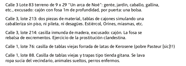 Esas casas habitadas por diez, quince y hasta veinte familias con abundantes proles en estos días calurosos se hacen insoportables por la descomposición de los residuos arrojados en pleno patio, por el estancamiento y descomposición de las aguas servidas y sobre todo por la falta de cloacas que, impidiendo los desagües regulares producen emociones pestilentes que fácilmente pueden ser el origen de enfermedades graves o epidemias”.9