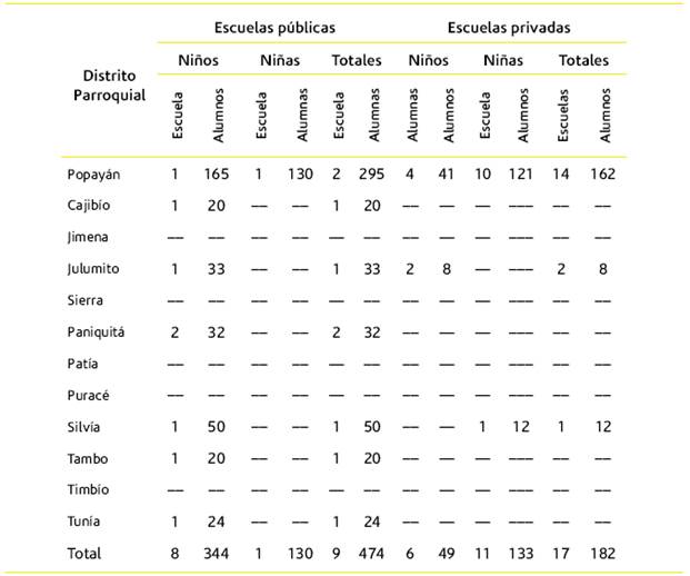 En el mismo sentido se inscribe la parroquia indígena de Jambaló, al norte de Popayán, perteneciente al cantón de Caloto. El 29 de noviembre de 1851, el alcalde parroquial Agustín Girón, informó que el día 23 el Cabildo había establecido "[...] la escuela de primaria de niños", que contaban con el local y los recursos para su mantenimiento. Solicitaba además apoyo de la gobernación para que Caloto enviase el cajón de los útiles, que por derecho les pertenecía y se les había asignado en 1847. Decían que si no era posible la remisión del cajón, se acopiaran excedentes de otras escuelas, para no ver "burlada las esperanzas de los vecinos", que contaban con los recursos económicos necesarios.25