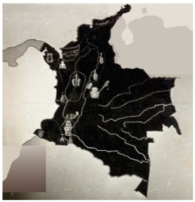 A pesar de la escasez del material fotográfico de archivo que mencionamos al comienzo de este trabajo, empecemos por el análisis de esta imagen (figura 1), reveladora en varios aspectos. Se trata de una pequeña fotografía del mapa ilustrado por Luis Alfonso Sánchez que acompañó la Exposición Arqueológica organizada por Gregorio Hernández de Alba en 1938 con motivo del IV centenario de la fundación de la ciudad de Bogotá. A pesar de que el arqueólogo reconoce que para ese momento el país había sido muy poco estudiado y que eran "bien escasas las excavaciones y exploraciones" (Hernández de Alba 1938, 10) conducidas técnicamente, se decidió a darle a la exposición una organización por zonas arqueológicas. Tanto la imagen que resalta en color oscuro el territorio nacional incluyendo a Panamá,2 como las representaciones de piezas arqueológicas recreadas como convenciones de cada cultura, nos llevan a pensar en el "mapa-logotipo, al instante reconocido y visible por doquier", del que nos habla Benedict Anderson (1993, 245). En él no hace falta incluir ninguna palabra; solamente delinear algunos de los ríos principales como hebras blancas contra el fondo oscuro y cercar con líneas puntuadas de maneras distintas, las imágenes de torteros, esculturas, tunjos, vasijas antropomorfas y poporos dibujados sin ninguna relación de proporción.