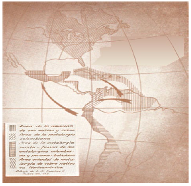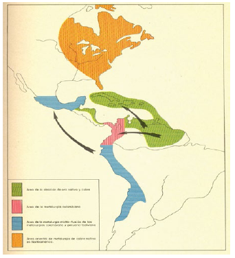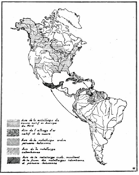 De hecho, el mapa no aparece al inicio sino al final de su trabajo, en las conclusiones generales, y no se ajusta del todo al discurso. Para Rivet y Arsandaux, desde una perspectiva general y amplia, solo existieron dos grandes provincias metalúrgicas en el continente. La primera estaba constituida por la orfebrería desarrollada en la mayor parte de Norteamérica -con excepción de Florida-, en donde según los datos que habían obtenido, se desconocieron las aleaciones y solo se trabajó con la técnica del martilleo en frio y en caliente. La segunda provincia comprendía América Central, Colombia, las Antillas, el extremo meridional de la Florida, las Guayanas, Venezuela, el territorio que se extiende al norte de la Amazonía y las regiones que constituyeron el antiguo imperio incaico (Rivet y Arsandaux 1946, 173-187).