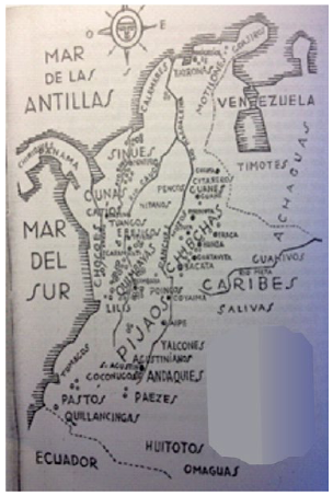 Un primer ejemplo de ello es la mención de los intercambios que los chibchas tenían con pueblos asentados en las costas del Caribe al norte o en las llanuras de los andaquíes al sur, o las descripciones de las ocarinas en forma de caracol marino fabricadas por ellos con absoluta precisión. Estos datos, revelaban flujos y redes extensas que conectaban a los indígenas del altiplano con territorios y sociedades que excedían el limitado espacio demarcado para ellos en el mapa.3 Algo similar ocurría con los quimbayas, pues luego de consignar la ubicación de este pueblo, de acuerdo a lo afirmado por Hernández de Alba (1938, 22), tenía que reconocer que según "[...] lo van revelando los estudios y hallazgos arqueológicos, la civilización de los quimbayas se extendió mucho más, debiendo pertenecer a ella parte de los pueblos llamados Catíos, Nutabes, Tahamíes y parte también del territorio en las márgenes del Cauca y en la orilla izquierda del Páez a los Pijaos".