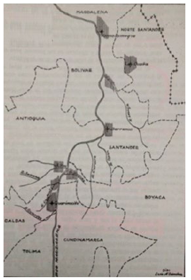 De este modo, todas estas variaciones y datos de diversa índole dificultaban la representación de dicha cultura en un mapa nacional o continental de manera definitiva; por ello en este caso Luis Alberto Sánchez elaboró una imagen cartográfica provisional, en la que tan solo se recreaba el espacio de los hallazgos arqueológicos y los datos históricos más fiables, y en la que además se agregaba el título de "Centros de la cultura del Río Magdalena", para lograr que el mapa tuviese el mismo carácter abierto del texto. Con la misma lógica, no se empleaban ya las imágenes de las urnas para identificar los lugares a manera de convenciones, sino sobrias líneas negras que cubrían pequeños espacios aledaños a la doble y serpenteante línea gruesa que recreaba el río Magdalena.
