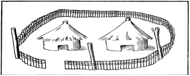 En el caso del artículo sobre el pueblo chibcha, Julio César Cubillos dibujó una lámina compuesta de dos imágenes. En la parte superior se presenta un croquis sencillo del territorio descrito por Edith Jiménez (figura 3); solo aparecen nombrados algunos de los ríos y lugares que según los cronistas de la conquista fueron más importantes para este pueblo por diferentes razones; los puntos fronterizos que servían de espacio de intercambio o donde se prestaba "especial vigilancia"; los cacicazgos más representativos, la mina de sal Zipaquirá y algunas de las lagunas sagradas; y en la parte inferior de la imagen (figura 4) se presenta el dibujo de una vivienda típica de techo cónico y con una columna central, rodeada por un cercado con algunos de sus postes de mayor altura, sugiriendo de manera sutil las prácticas rituales y sacrificiales a las que se refiere el texto: el cortejo del matrimonio, el entierro de niñas en el centro de la choza para "asegurar la buena suerte de los que vivían en la casa" (Jiménez 1945, 121) y el sacrificio que los conquistadores llamaron de la gavia.
