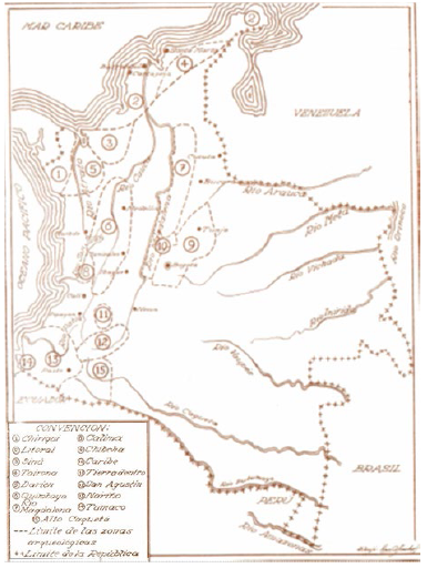 En primer lugar, la zona bautizada con el nombre de Mosquito por Hernández de Alba apareció en este mapa denominada como río Magdalena y lo que para el mismo autor era el área arqueológica del Putumayo, fue designada como Alto Caquetá. Se presentan los siguientes interrogantes: ¿Resistencia a denominar un espacio selvático como una zona arqueológica? ¿Necesidad de acercar mediante un nuevo nombre los vestigios del pasado a los pueblos de la montaña, de acuerdo al esquema que excluía cualquier indicio de civilización de la selva y las tierras bajas del oriente? Estas preguntas nos acercan al peligroso terreno de la sobre interpretación; sin embargo, es necesario dejarlas planteadas, existe otro detalle que tiene lugar en el mapa y que no deja de despertar inquietudes. La zona arqueológica de Chiriquí que en la carta de 1938 aparecía situada de manera más o menos aproximada a la provincia del mismo nombre ubicada al occidente de Panamá, se trasladó aquí mágicamente al interior de los límites del territorio colombiano.7 Este desplazamiento se puede interpretar como una tentativa de "nacionalización" de un área arqueológica que representada con un poco más de precisión hubiese deformado el croquis del mapa-logotipo con el agravante de evocar el territorio perdido a comienzos de siglo. Dos aspectos que un mapa nacional no podía permitirse.