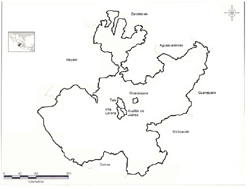 El mundo rural del occidente de México, donde se encuentra el estado de Jalisco (figura 2), tuvo particularidades propias, desde la época prehispánica; había menos densidad de población y un desarrollo cultural especial más modesto con respecto a las culturas del centro y suroeste de Mesoamérica (Weigan y García 2008). El desarrollo de la sociedad colonial, por lo tanto, también tuvo sus particularidades. Las grandes haciendas convivieron con un gran número de ranchos y pueblos indios. Estos últimos fueron perdiendo su identidad y esencia indígena y se mestizaron en gran parte, de tal manera que se incorporaron a la nueva sociedad colonial y a su economía. Hacia los siglos XIX y XX una porción mayoritaria de las poblaciones rurales en el estado de Jalisco habían perdido sus rasgos indígenas (Calvo 1991 y 1992; Serrera 1991; Van Young 1989).