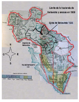 La formación del ejido del poblado de Bellavista se llevó a cabo entre 1932 y 1945, por ser el casco de la hacienda, sus habitantes solo tuvieron derecho de solicitar tierras hasta que se hicieron las reformas de 1927 y 1929. Bellavista no era un pueblo indígena de origen colonial ni mucho menos prehispánico, el caserío surgió junto con el ingenio azucarero a mediados de la década 1870. Sin embargo, hasta el 7 de marzo de 1924 dejó de ser considerado como un simple caserío de la hacienda, debido a que el gobernador del estado de Jalisco, José Guadalupe Zuno, expidió un decreto que erigió al poblado de Bellavista en comisaría política,2 dándole el estatuto jurídico y político de poblado con comisaría. Por este cambio los habitantes del núcleo de casas situadas al lado de la fábrica de azúcar pudieron tener derecho a solicitar tierras posteriormente.
