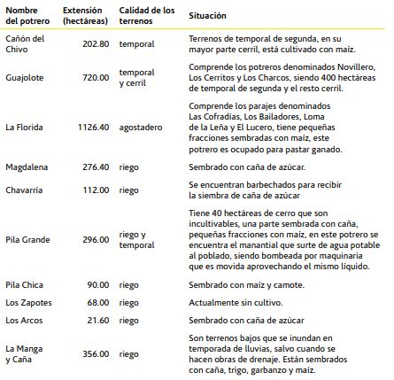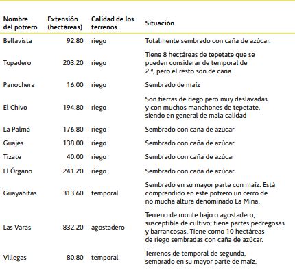 Al final de la inspección, el 6 de noviembre de 1935, se levantó un acta en la cual se consignó, con la mayor precisión posible, cada uno de los diversos aspectos de lo expuesto por los miembros del comisariado. Aplicar en los hechos la resolución presidencial no fue sencillo, porque se tenía que respetar el fallo en dos puntos esenciales: 1) dotar al ejido con 705 hectáreas (en adelante has.) de riego, y 2) respetar a la finca una extensión de 416.91 has., de terrenos sembrados con caña. Por otra parte, algunos terrenos que les fueron otorgados a los ejidatarios estaban sembrados con caña al momento de la entrega formal, pero la siembra de dicha caña la había hecho el propietario de la hacienda, por tanto, según lo especificado por la ley, estos sembradíos de caña se tenían que respetar hasta que la caña sembrada rindiera sus frutos y pudiera ser cortada por el propietario de la finca, esto llevaría de uno a tres años, sólo después de ese periodo, los ejidatarios podrían tomar posesión real de dichos terrenos. El problema se centraba en 104 has., para solucionar este asunto se les dieron provisionalmente a los ejidatarios una extensión similar, pero en los terrenos del potrero denominado El Plan, propiedad de la hacienda.23