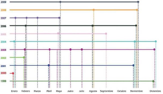 Como consecuencia de todo lo anterior, se produjo un clima tenso en la institución, haciendo coincidir a los distintos actores afectados (profesores, estudiantes, trabajadores administrativos) que, frente a las irregularidades e incertidumbres, respondieron con la movilización social. Acciones de hecho como paros, plantones y bloqueos, se hicieron recurrentes en el periodo que abarca este estudio (figura 1). Conllevando a la visibilización de los líderes de los movimientos estudiantiles y sindicales, con efectos perversos sobre sus personas y colectividades, ya que se estableció una estrecha relación entre actos de protesta y los hechos de violencia.30 Por cada protesta había una respuesta violenta de parte de los grupos paramilitares y, en ocasiones, de las fuerzas policivas.31