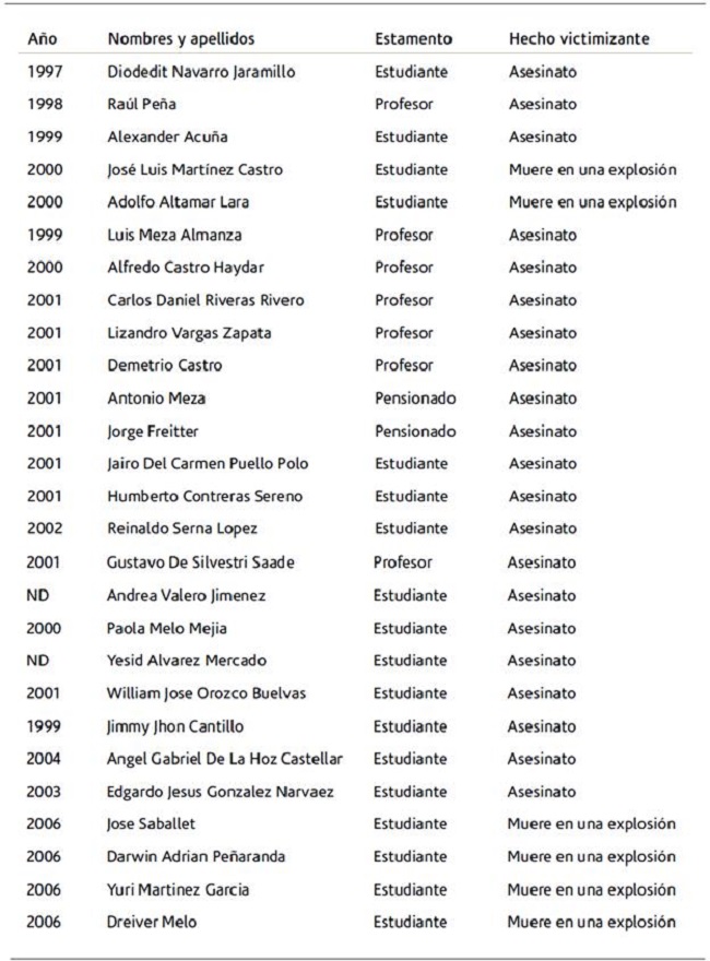 El ciclo se componía de seis hechos victimizantes: estigma, amenaza, desplazamiento, hostigamientos y detenciones arbitrarias, y finalmente el homicidio. En la Universidad, según lo registra el universo de víctimas construido en el proceso de investigación, se dieron 79 de estos hechos distribuidos entre amenazas (36), desplazamiento (18), homicidios (22) y muertes por artefacto explosivo (6) (tabla 1) relacionados con la presencia paramilitar en la institución.