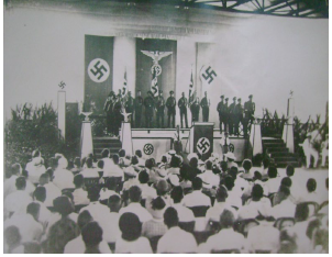 Ya para ir cerrando este apartado y volviendo sobre uno de los aspectos de la vida del Colegio Alemán en Barranquilla en los años treinta como lo fue la conexión con el proyecto político nacionalsocialista, es importante mencionar que las instalaciones de la institución educativa sirvieron de espacio de encuentro del grupo nazi local y también de lugar de conmemoración de fechas representativas dentro del calendario nacionalsocialista. Muchas de estas actividades, tanto las reuniones como las conmemoraciones, presentaban un fuerte componente cultural, constituido por interpretaciones musicales, pequeñas representaciones teatrales y lectura de textos de literatura alemana, por mencionar algunas, que en su conjunto integraban unas prácticas orientadas a la preservación y la difusión de la cultura alemana, aunque, bien merece ser mencionado, en alguna medida instrumentalizados por el Nacionalsocialismo.