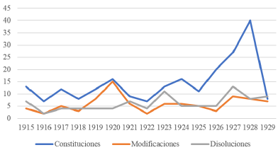 El registro público notarial evidencia un aumento de las constituciones y modificaciones de empresas durante el lapso estudiado (ver figura 1). Los años de mayor crecimiento empresarial (1920, 1924 y de 1926 a 1928) coinciden con decrecimientos de los registros de disolución, salvo en 1927, lo que sugiere una posible reorganización de las actividades empresariales formales.