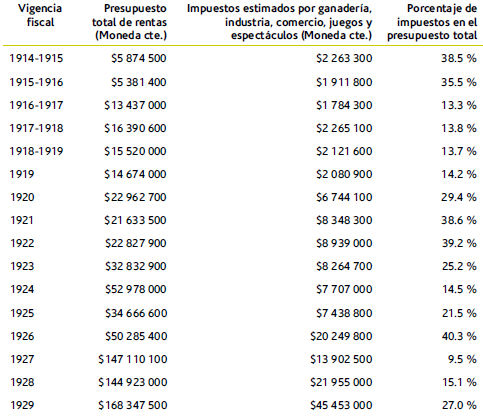 Ante las limitaciones de la información ya señaladas sobre la estadística municipal, una manera de evidenciar si la actividad comercial en Cali crecía es a partir de inferencias sobre las rentas de la administración municipal. De sus presupuestos se puede inferir cómo se esperaba que se comportara la actividad empresarial en ese momento. La siguiente tabla (ver tabla 1) expone el total de las rentas y contribuciones que proyectaba recaudar la administración local en cada vigencia fiscal. Resalta el paulatino aumento de los recaudos estimados entre 1914 y 1929. La tabla expone el monto y el porcentaje en los sectores agropecuario, comercial, industrial, de juegos y espectáculos públicos.