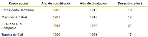 Los negociantes de Cali de inicios de siglo presentaron no sólo una escasa especialización de sus actividades económicas, sino también una estrecha relación entre la administración y la propiedad del negocio. Un rasgo común entre estos y los estudiados por Alfred Chandler (2008) en la empresa norteamericana tradicional -cuyo desarrollo estuvo marcado por la aparición de una clase de ejecutivos asalariados- es la corta duración de las sociedades comerciales, en ocasiones por los mismos motivos: "La vida de las empresas tradicionales era, por lo general, efímera. Casi siempre eran sociedades colectivas que se reconstituían o disolvían a la muerte o jubilación de un socio" (Chandler 2008, 25). Fue con el acelerado ritmo de la innovación tecnológica y la demanda de consumo cada vez más creciente en Estados Unidos en la segunda mitad del siglo XIX que apareció la empresa moderna, como una respuesta institucional al cambio.