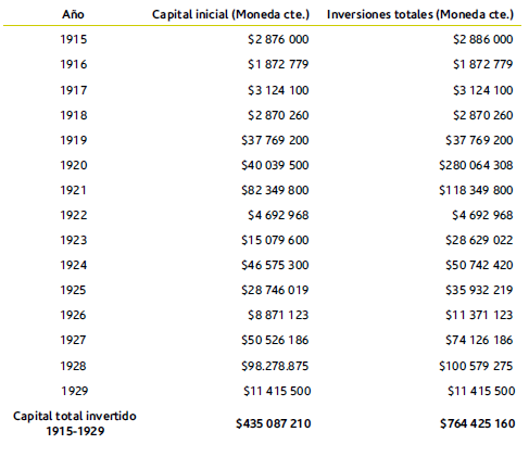 Las inversiones cuantiosas se dieron en 1920 y bastante menos en 1921, datos que, junto a los registrados en el párrafo precedente, señalan que en el inicio de la década se formalizaron las principales actividades en términos de inversión de capital.
