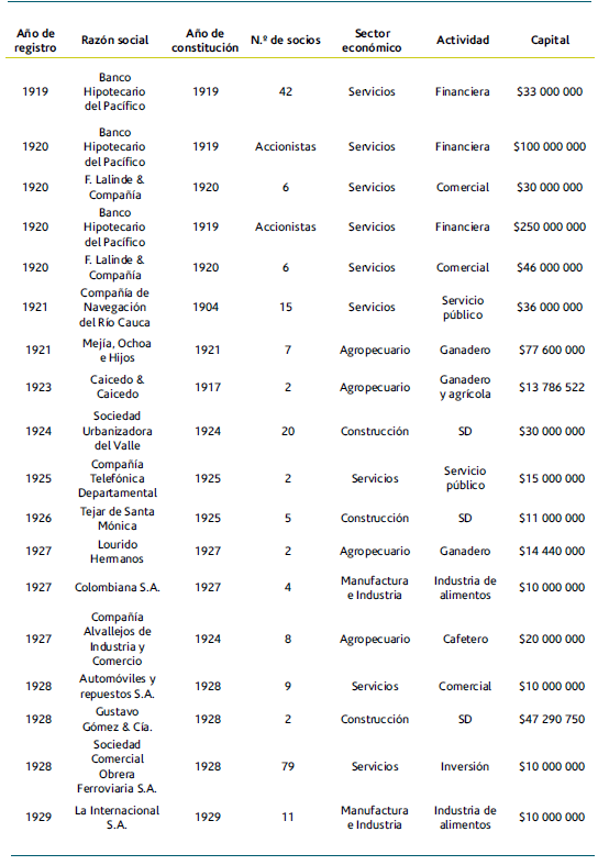 Teniendo en cuenta la tabla 6, se puede afirmar que los mayores aportes de capital por empresa son los que más socios reunieron, si se considera que el 77 % de empresas eran sociedades de no más de tres inversionistas. Es decir, las empresas con los mayores capitales pueden estar indicando que tales cifras se sostenían por la suma de aportes individuales, en algunos casos bastante moderados. Sin embargo, varias firmas lograron capitales sociales importantes con tan solo los aportes de dos socios. Debe distinguirse que estas son empresas de propiedad de personas identificadas como de élite regional, los Caicedo y Lourido, por ejemplo. En el caso de la Compañía Telefónica Departamental, los socios fueron el comerciante Emanuel Pinedo y la Gobernación del Valle del Cauca, en cabeza del gobernador Manuel Antonio Carvajal, lo que supuso abundancia de capitales. Todos los sectores económicos participan, en algún grado, en la lista de la tabla 5, pero es el BHP la empresa de mayor inversión, coincidiendo con el inicio de la década del veinte.