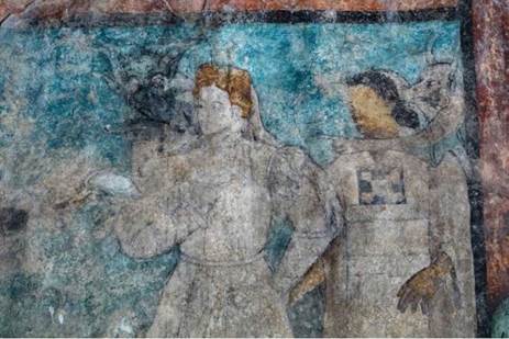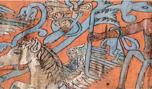 Este texto arroja luz sobre el significado de la imagen discutida y da un giro inesperado: la escena es una alusión al castigo a las mujeres que cayeron en el pecado de la lujuria. Esta interpretación concuerda con la lectura de algunas escenas del friso alto y del friso bajo. En el primer caso, Pablo Escalante Gonzalbo (1999, 36) señala que una cabeza decapitada, junto con un alfanje y una rodela, representan a Holofernes decapitado por Judith, es decir, un rey muerto por su lujuria (ver figura 10). Como se explicó en la nota 3, una de las lecturas más aceptadas del friso bajo, asegura que se trata de una psicomaquia, en donde luchan vicios y virtudes, pero al parecer el pecado que mejor se ha identificado es el de la lujuria (Pérez 2017).