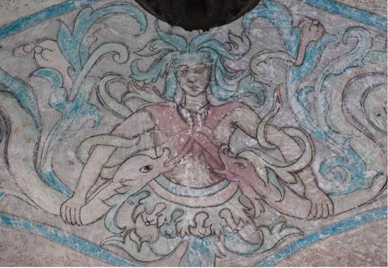 Las pinturas de los indígenas no necesariamente se podrían ajustar al 100 % a los grabados en medida de que existiera la necesidad de adecuar la imagen a requerimientos expresivos específicos (Alcalá 2014, 41). En un plemento de la bóveda del coro de la iglesia del ex convento de San Miguel Arcángel de Ixmiquilpan, se encuentra una imagen que no ha sido estudiada y que considero que sufrió varias adecuaciones de carácter indígena. En la figura 1 se puede observar a un personaje grutesco que en lugar de cabellera luce vegetación suelta, de la cintura para abajo su cuerpo está formado de elementos vegetales, con ambas manos sostiene a dos personajes cuyo cuerpo alargado nos recuerda a un par de serpientes, su terminación en espiral sugiere un cascabel grutesco.