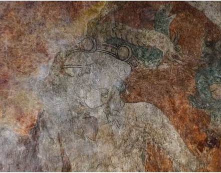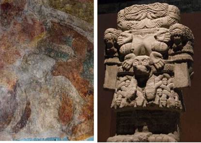 En la figura 3 se compara un personaje de interés para la presente discusión con la escultura monumental de la Coatlicue en el Museo Nacional de Antropología, México. Donde se aprecia medio cuerpo del personaje en cuestión, su mano izquierda presenta una suerte de garra demoniaca, mientras a manera de collar porta corazones y manos humanas, la cabeza es un diseño difícil de identificar pues no tiene ojos, nariz, boca, más bien se observa una forma alargada de la que salen dos serpientes, posiblemente haya habido más, pero el estado de conservación de la pintura no permite asegurarlo. La carencia de cabeza humana, las serpientes en lugar de cabeza y el collar de corazones y manos humanas (ver figura 4) resultan rasgos muy sugerentes.10