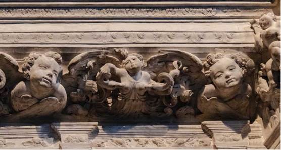 La imagen de la bóveda del coro de la iglesia de Ixmiquilpan se puede suponer que es contemporánea al friso bajo, en cuanto a que tiene una paleta cromática semejante, así como la presencia de manos indígenas, según quedó asentado páginas atrás. Por consiguiente, se puede indicar que es del último tercio del siglo XVI. Por su parte, la imagen de Ávila fue entallada en la década de 1530 y previa a esta existen otras imágenes de mujeres con serpientes que tienen su boca en los senos. ¿Las imágenes del románico y el gótico qué representan? Como menciona Luis Huerta Huerta, iconográficamente la asociación entre la mujer y la serpiente es muy antigua, proviene del imaginario clásico: "Leclercq Kadaner situó el origen de este modelo iconográfico en las representaciones clásicas de Gea, la Tellus, o Madre Tierra de los romanos, que era mostrada amamantando a todas las criaturas [...]" (Herrero 2016, 109-112; Huerta 2006, 93-94). Durante la Edad Media esta fórmula fue adaptada para representar a la lujuria y su castigo, situación por la cual las serpientes y criaturas que antaño eran amamantadas ahora son agresoras pues: "[...] el elemento activo se invierte y la mujer ya no amamanta a los animales, sino que estos atacan sus partes más sensibles" (Huerta 2006, 93-94). Iconográficamente, cambió el significado de las imágenes, pero en el ámbito popular se mantuvo el mito de las serpientes lactantes. La iconografía medieval de la mujer con serpientes en los senos servía para representar el castigo por la lujuria. Es posible que los personajes alados de Ávila no sean angelitos sino puttis, es decir, servidores de Cupido y Venus, los puttis pueden representarse de manera híbrida (García 2001, 120) con elementos animales y humanos, como en el caso del grabado de la figura 4. Su asociación con el amor y el erotismo compagina con la idea del castigo por la lujuria, así como con el carácter grutesco de la escena del trascoro de Ávila y el sotocoro de Ixmiquilpan.