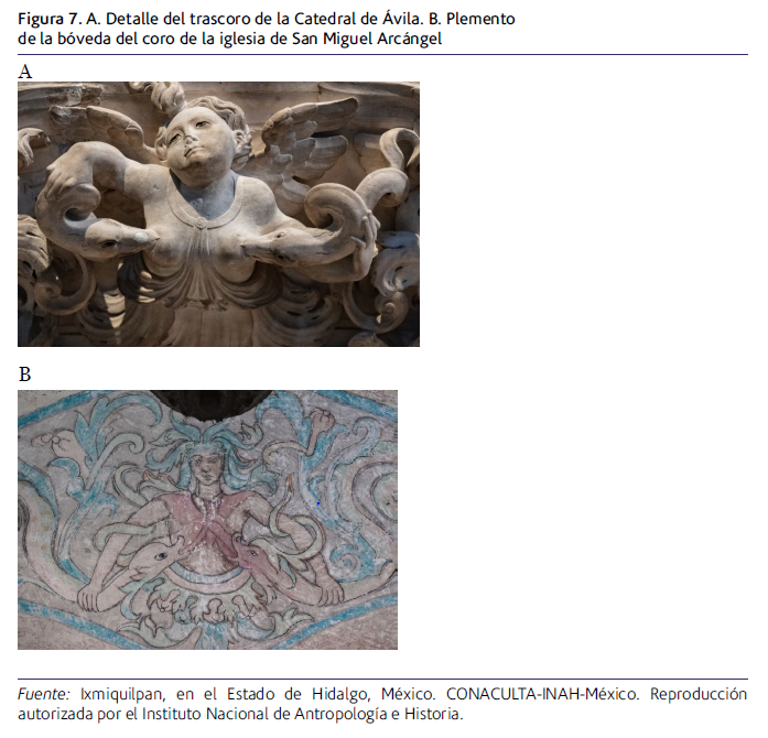 Las semejanzas son las siguientes: se trata de una escena de tres personajes, uno es un sujeto femenino con cuerpo vegetal de la cintura para abajo, los otros dos personajes tienen cuerpo de serpiente y cola fitomorfa. Es diferente de la imagen de Ixmiquilpan porque la posición de los personajes serpentiformes está invertida, tienen cabeza humana que no hace contacto con la mujer grutesca, ella se cubre los senos con sus colas y los personajes serpentinos tienen alas. Esta imagen se puede considerar como una variante del esquema de la mujer con serpientes en los pechos. Por lo tanto, pueden existir otras variaciones que formarían parte de una serie de imágenes. Tomo como punto de partida esta hipótesis para estudiar otra imagen muy cercana a la del sotocoro de Ixmiquilpan y que sugerentemente está localizada en el trascoro de la catedral de Ávila, en España.12 En la figura 6 se aprecia que las dos imágenes anteriores son muy cercanas a esta: Se puede distinguir dos serpientes en el aparente acto de lactancia las cuales tienen su boca sobre los pechos de un personaje alado cuya zona media-inferior de su cuerpo está formado por hojas de acanto, mientras que tanto a la izquierda como a la derecha vemos a dos personajes con cuatro pares de alas: tienen un par en la espalda y un par en el pecho, pero estas están flexionadas o resguardadas.