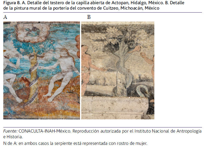 También hay escenas de serpientes asociadas con mujeres en la capilla abierta del convento de San Nicolás Tolentino, Hidalgo, México. Aquí fueron pintadas dos escenas que resultan de interés para este trabajo: en la primera se narra el pecado original provocado por la serpiente, que en realidad es el demonio disfrazado; conforme al relato bíblico, ella instigó mediante engaños a la desobediencia de la humanidad, pues Eva y Adán comieron del fruto prohibido. La serpiente en su identidad demoniaca era vista como un enemigo de la humanidad, este mismo tema lo retomaron los pintores de los muros de la portería del convento agustino de Cuitzeo en donde también está representado el pecado original (ver figura 8). Cabe destacar que en ambos casos el rostro del ofidio parece el de una mujer.13
