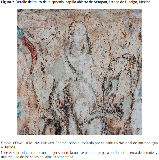 En la otra escena, ubicada en el lado de la epístola de la capilla abierta, varios personajes arden en el infierno, aquí una mujer tiene su cuerpo rodeado por el de una serpiente (Estrada 2011, 266) que castiga a la mujer, recordando vagamente a la pintura del convento de Atlihuetzia. Observando con detenimiento la imagen, se puede apreciar que la cola de la serpiente está en la entrepierna de la mujer, y lo que muy probablemente sea su cabeza está en la zona del pecho, justamente mordiendo un seno, la imagen está muy deteriorada, pero en el detalle de la figura 9 es posible advertir los elementos descritos.