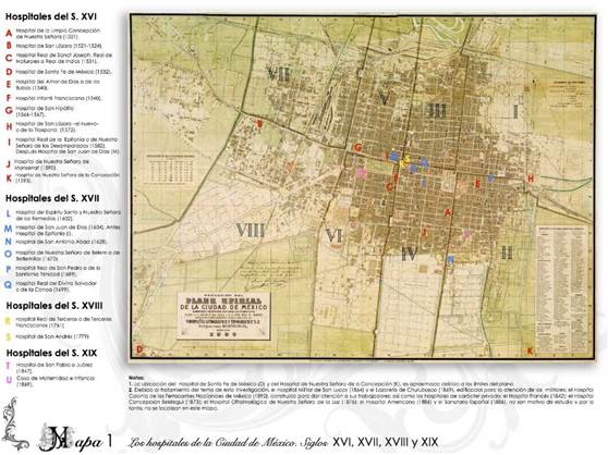 En este contexto y debido a la importancia de la Ciudad de México como sede de la Corona Española, Hernán Cortés mandó a edificar en 1521 el Hospital de la Limpia Concepción de Nuestra Señora, siendo el primero en Nueva España (Muriel 1956, 37). En los años inmediatos, hasta los siguientes tres siglos, proliferaron rápidamente, gracias al mandato de Carlos I, de fundar hospitales en todos los pueblos, con la finalidad de curar a los pobres y desempeñar la caridad cristiana, expedido en la Real Cédula del 7 de octubre de 1541 (Muriel 1960, 262). Por lo tanto, durante el siglo XVI, se erigieron once nosocomios en la Ciudad de México2 de un total de ciento veintinueve; en el siglo XVII, seis3 -de un total de veinticinco-; durante el siglo XVIII, dos4 -de un total de diecinueve-; y por último, en el siglo XIX, durante el México independiente, también dos más.5 En la figura 1, se puede observar la disposición geográfica de los hospitales antes mencionados.